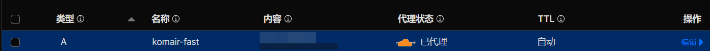 1. 我这边有两个域名,9910.site,61616.top,其中9910.site作为访问域名,61616.top作为加速域名;一个 komari 服务需要使用到优选ip,我打算访问的域名是 komari.9910.site,正常步骤应该是将域名 komari.9910.site 使用 A 记录解析到我的服务器ip上并开启小黄云,但是我们不能这样干,我们将 komair-fast.61616.top 使用 A 记录解析到我的服务器ip上并开启小黄云