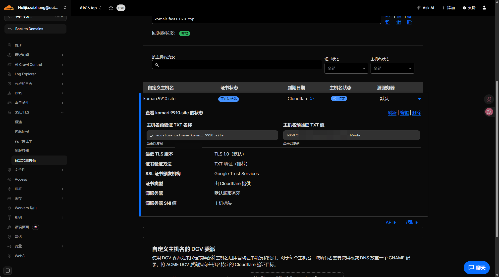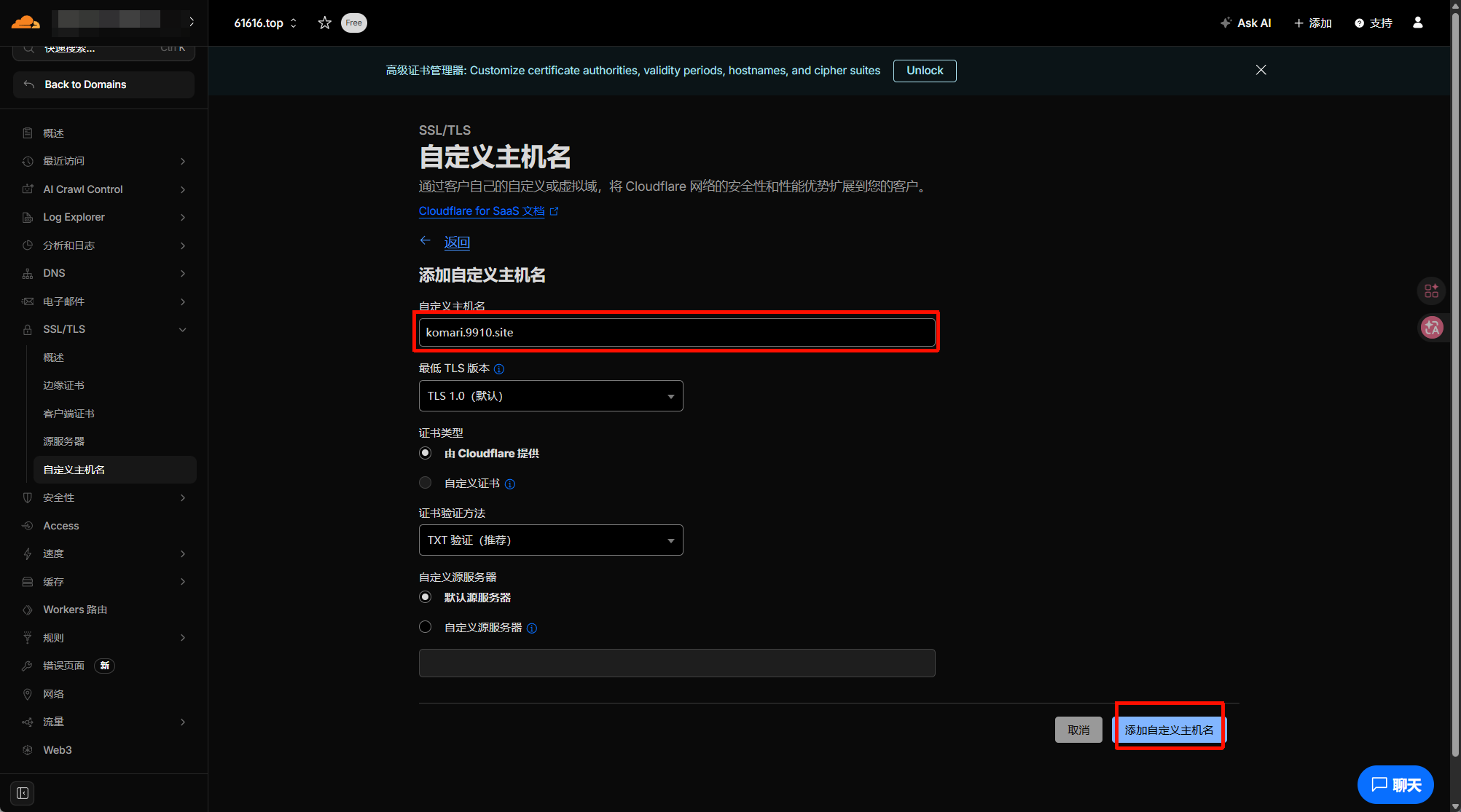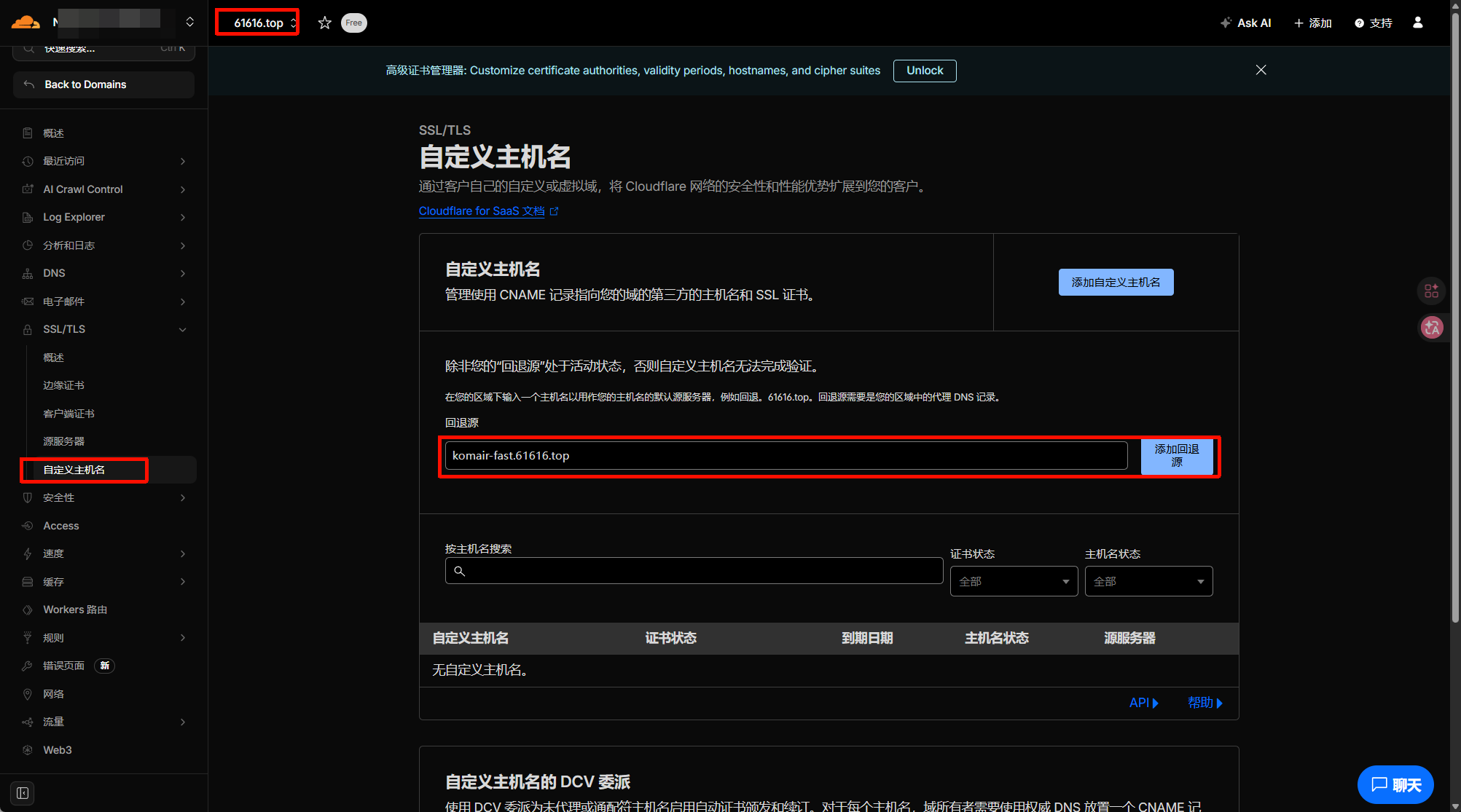 2. 61616.top下面的 SSL/TLS 下选择 自定义主机名自定义主机名选项需绑定支付方式才能打开,将 komair-fast.61616.top 这个域名添加为 回退源
