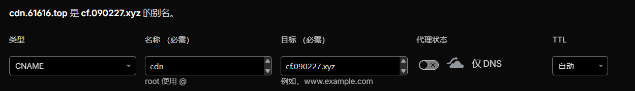 5. 然后我们引入一个新的域名 cdn.61616.top 作为加速域名,将 cdn.61616.top 使用 CNAME 记录解析到 cf.090227.xyz 上同时不要开启小黄云