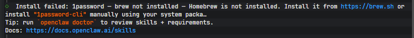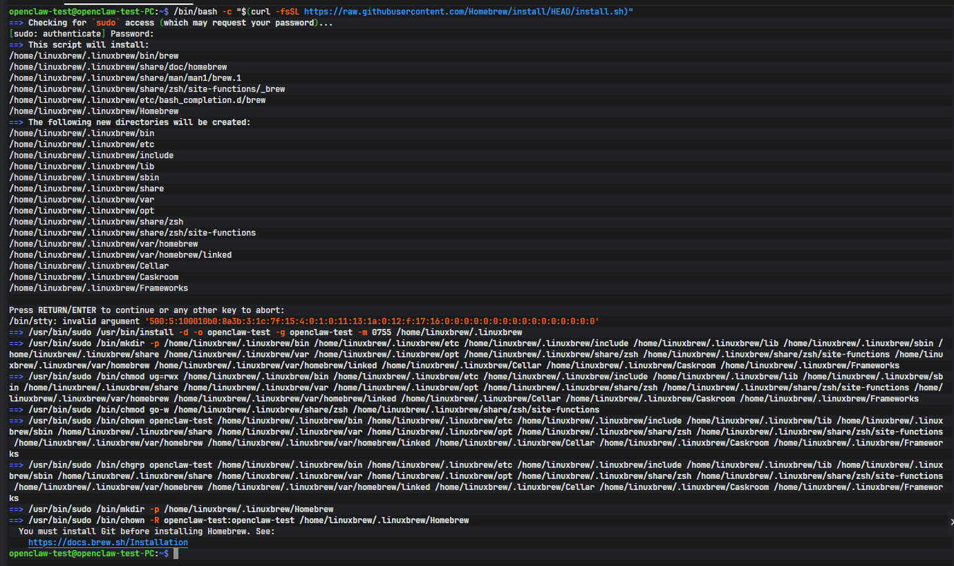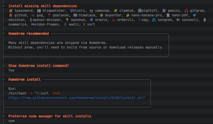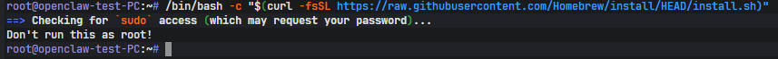 OpenClaw在安装skils时推荐使用 Homebrew 来解决依赖问题,,所以我们先提前给安装上,不安装的话后续装skills可以会出现以来错误