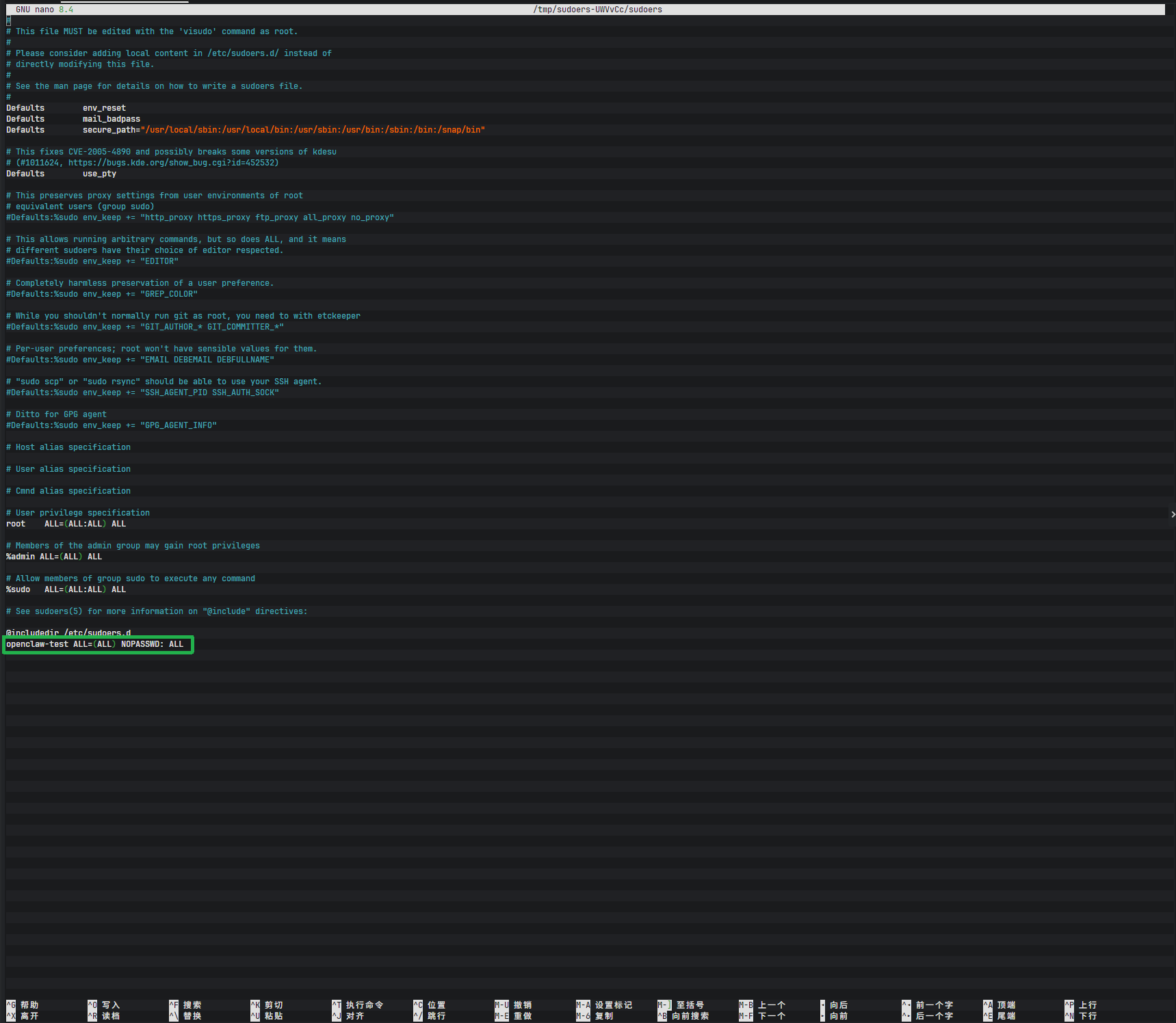 输入 sudo visudo ,在打开的文件中的最下方输入 用户名 ALL=(ALL) NOPASSWD: ALL ,我的用户名是 openclaw-test,所以我这里的命令就应该填 openclaw-test ALL=(ALL) NOPASSWD: ALL