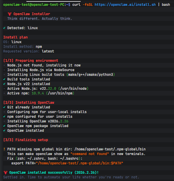 curl -fsSL https://openclaw.ai/install.sh | bashOpenClaw 会自动安装需要的依赖,一开始只要耐心等待即可