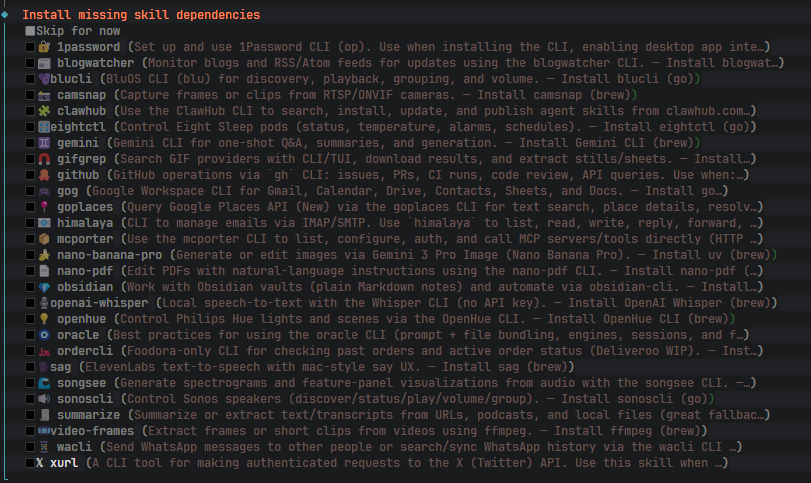 ◆ Configure skills now? (recommended)│ ● Yes / ○ No时候按需要选择,如果选择是下面是所有的skills,各位按需选择,选择完之后回车会安装选择的skills(按空格进行选择)