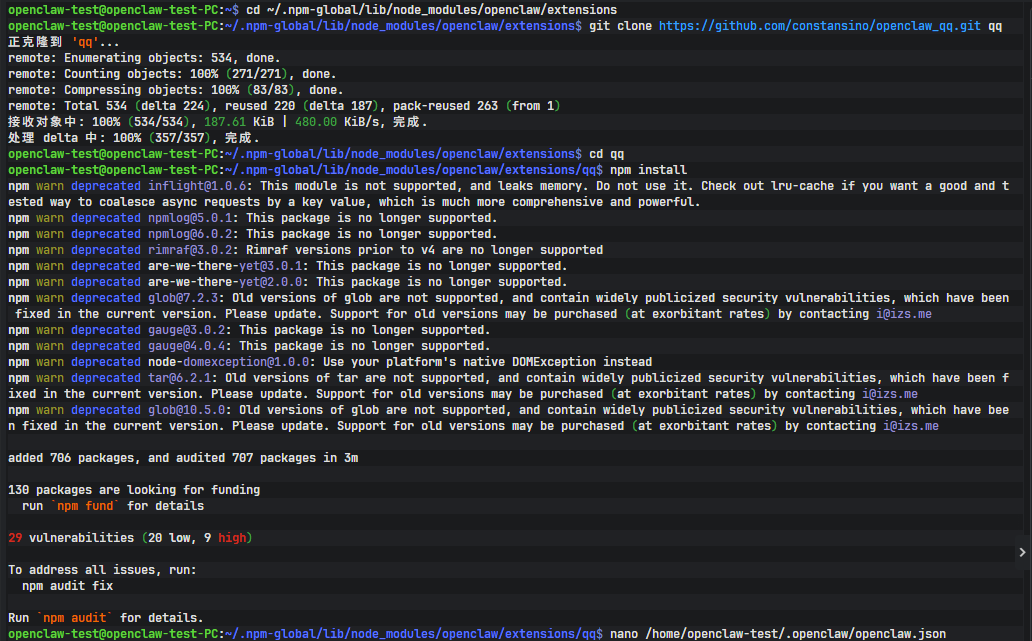 使用项目地址: napcat:GitHub - NapNeko/NapCatQQ: Modern protocol-side framework based on NTQQ napcat-docker:GitHub - NapNeko/NapCat-Docker: NapCat-Docker 插件:GitHub - constansino/openclaw_qq: Standalone QQ extension for Moltbot using OneBot v11 protocol